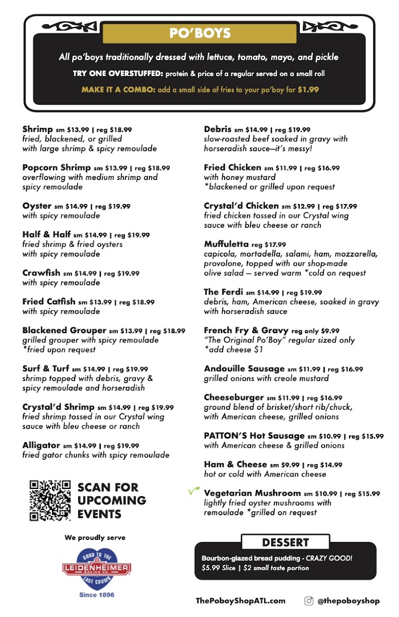 Welcome to The Po'Boy Shop & Basement Bar, where the vibrant spirit of New Orleans comes alive in Decatur, GA. Nestled at 1369 Clairmont Rd, this culinary gem specializes in authentic po'boys, featuring mouthwatering options like the blackened shrimp and grouper sandwiches. Our story is one of passion for food and hospitality, where each dish is crafted with love and a touch of Louisiana flair. The bustling atmosphere offers a charming bar experience downstairs, perfect for enjoying flavorful Cajun dishes like gumbo and spicy crawfish pies. Join us for a taste of home and a memorable dining adventure!